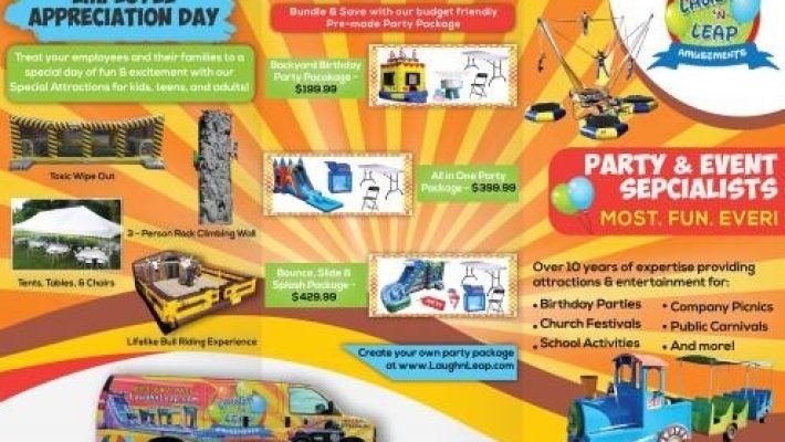 We are your professional party rental company located in Orangeburg, SC. We service all areas of Orangeburg 29115 and 29118. Our service also extends to surrounding Calhoun County areas. We provide bounce house rentals, inflatable water slides, Rock climbing Wall, Mechanical Bull, and Bungee Trampolines. We also setup large tents for outdoor gatherings and special events. Laugh n Leap of Orangeburg is the only company in the area that carries unique attractions and entertainment.
